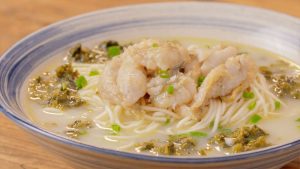 这碗青翠欲滴香葱点缀,晶莹“首石”鱼肉盖顶的浓汁面,鱼肉洁白细嫩,富有弹性,面汤葱香扑鼻,鲜美醇厚,面条软硬适中,滑爽可口。