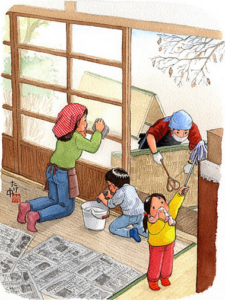 等室内尘埃落定,一家人分工合作,有的用湿布揩去室内角角落落和每件家具上的浮灰;有的用湿布和旧“申报纸(报纸)”擦玻璃窗,申报纸揩玻璃窗效果非常好,不留一点花斑,扇扇揩得晶光敞亮。