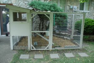 伊在原先汽车间前的菜地上熟练地打下一根根木桩,再用铅丝把铁丝网结结实实固定在木桩上,四面围墙做好后,在顶部也绑上铁丝网,铺上防雨油毛毡,然后做栅栏门。仁仁一直在旁边看着,给小虎哥哥递工具,递材料。