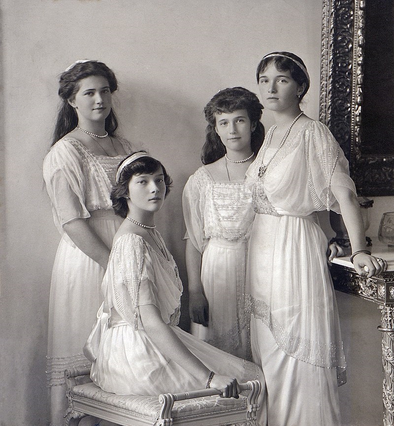 从左而右分别是沙皇的三个女儿玛丽亚大公、塔季扬娜大公、阿纳斯塔西娅大公与奥丽加大公,摄于1914年,即她们被枪决前三年的合影。