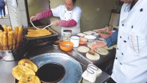 须臾,人群中三位动作利索的妇女挎着塞满小菜的杭州竹篾篮,提着穿满油条的稻草梗,拎着盛满豆浆的小铝锅,小锅柄上还挂着一只白布袋,里面芝麻咸大饼糖汁甜大饼喷喷香,伊拉急匆匆走出菜场,穿过马路,轻轻推开弄堂铸铁大门一侧的边门。