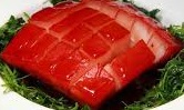 锅里再注入清水,放入五花肉,再放一小把生姜片和一个葱结,大火煮沸后转小火煮约七,八分钟,捞出,用镊子拔去猪毛,洗净,将基本定型的五花肉切成一寸半见宽,四寸半见长的条状。炒锅加入菜油猪油,少许白糖,至油七分热,放入五花肉,文火煎至四面微黄,注入少量花雕,文火慢慢炖,等肉酥烂,加红酱油鲜酱油冰糖微火焖,最后旺火收汁,酱汁肉烧好了,整条酱汁肉外面油亮赤红,里面晶莹雪白,用刀切成片状,每片肉中间雪白四周酱红,姆妈拿来一只白瓷菜盘,将热锅热油煸炒好,油珠闪闪,碧绿生青的红嘴绿鹦鹉菠菜平铺盘底,上面整整齐齐码上两排酱汁肉。