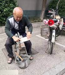 过去几步路,是磨刀师傅的摊头。过年过节是磨刀匠师傅进账最好的辰光,家家户户大斩小切,刀刃钝了,刀口勚了,各家掌勺大厨侪来央求磨刀师傅。