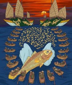 这个时节黄鱼肉头最丰肥,渔民敲罟围捕,用竹筒猛烈敲击绑在渔网上的竹竿,声波传到水下,与大黄鱼耳石共振,致鱼晕厥漂浮,渔民趁机围捕,大小黄鱼大量上市,是吃黄鱼的好季节。